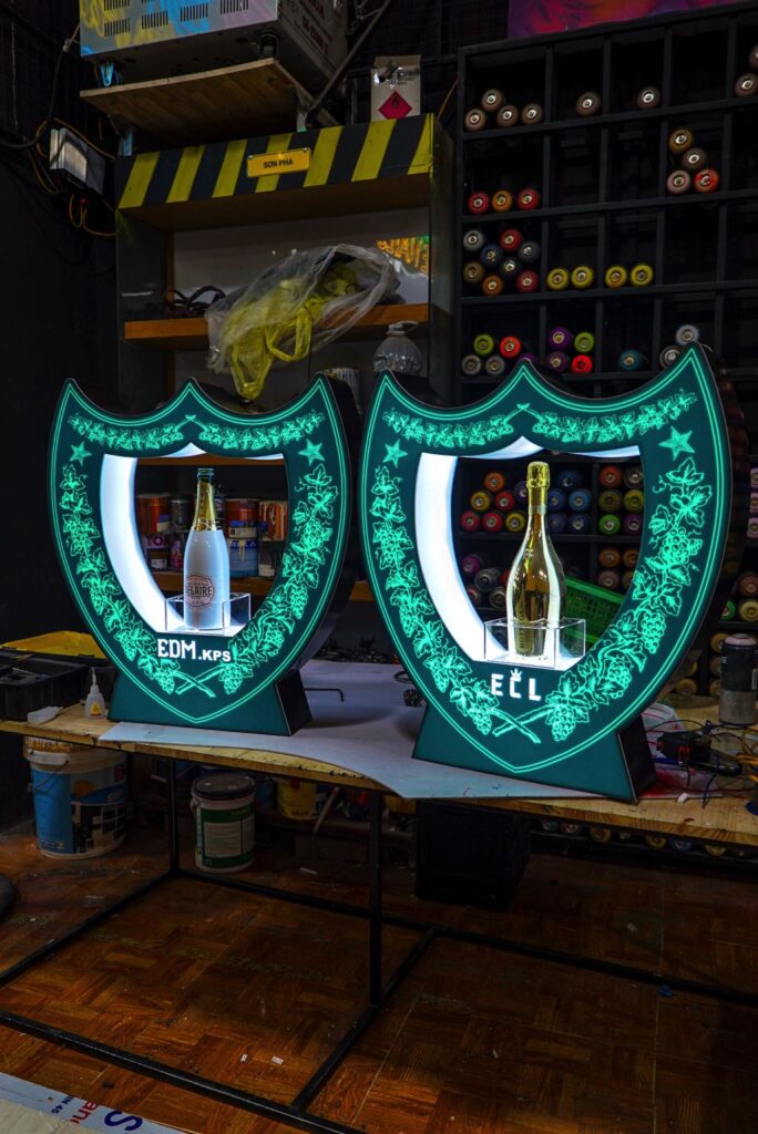 Mỗi sản phẩm được thiết kế riêng phù hợp với thương hiệu của bạn. Biển hiệu được thiết kế đi kèm khay để cài rượu.