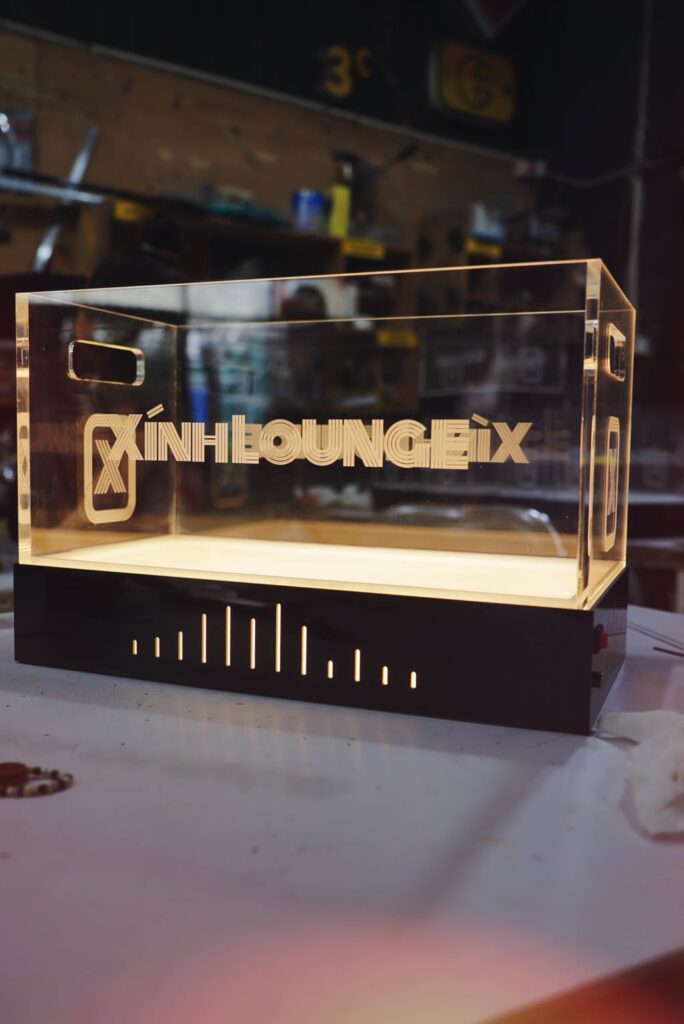 - Chat lieu: Mica 1mm ghép hộp, phát sáng đáy